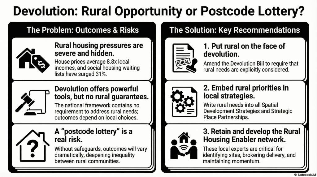 The study shows that devolution gives local leaders new powers over housing, planning, and investment. These tools could be used to tackle rural housing challenges – but there are no guarantees. The national framework contains no requirement to address rural needs, meaning outcomes will depend on local leadership and choices.