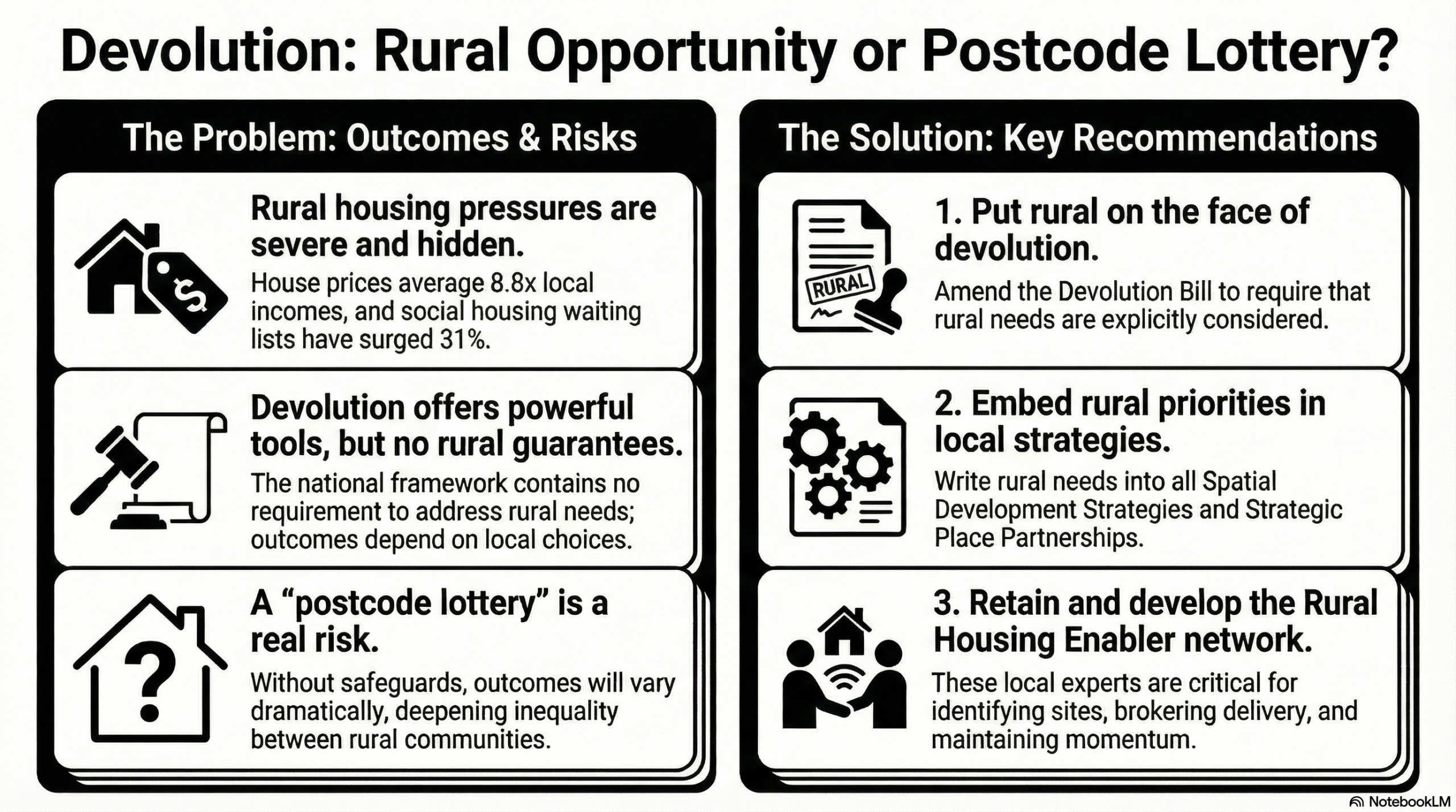 ➡️ Leadership and partnerships matter. In places like York & North Yorkshire, a proactive mayor and strong rural housing networks have helped embed rural priorities in devolved strategies.